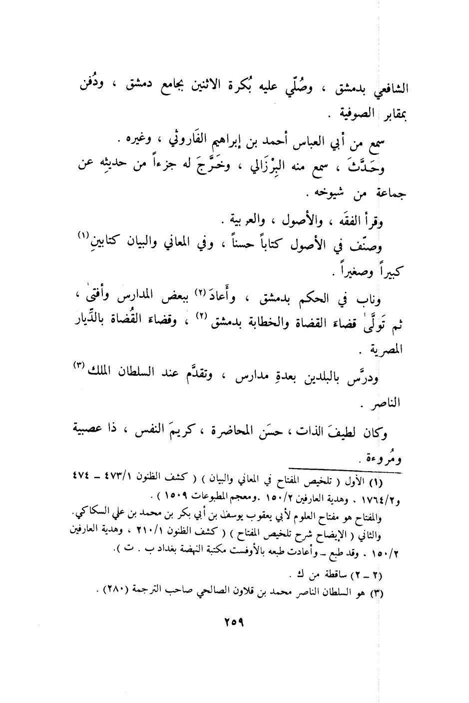 ودرس بالبلدين بعدة مدارس وَتقدم عِنْد السُّلْطَان الْملك النَّاصِر