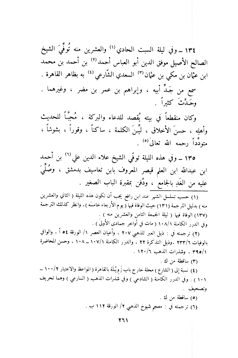 134 - وَفِي لَيْلَة السبت الْحَادِي وَالْعِشْرين مِنْهُ توفّي الشَّيْخ الصَّالح الْأَصِيل موفق الدّين أَبُو الْعَبَّاس أَحْمد بن أَحْمد بن مُحَمَّد ابْن عُثْمَان بن مكي ابْن عُثْمَان السَّعْدِيّ الشارعي بِهِ بِظَاهِر الْقَاهِرَة
