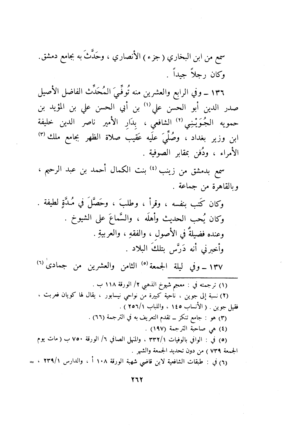 136 - وَفِي الرَّابِع وَالْعِشْرين مِنْهُ توفّي الْمُحدث الْفَاضِل الْأَصِيل صدر الدّين أَبُو الْحسن عَليّ بن ابي الْحسن عَليّ بن الْمُؤَيد بن حمويه الْجُوَيْنِيّ الشَّافِعِي بدار الْأَمِير نَاصِر الدّين خَليفَة ابْن وَزِير بَغْدَاد وَصلي عَلَيْهِ عقيب صَلَاة الظّهْر بِجَامِع ملك الْأُمَرَاء وَدفن بمقابر الصُّوفِيَّة