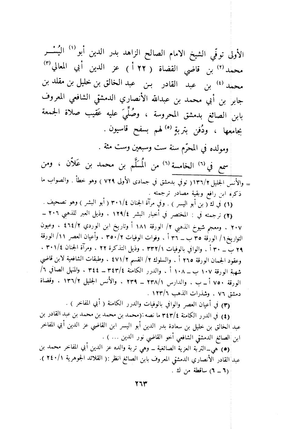 الأولى توفّي الشَّيْخ الإِمَام الصَّالح الزَّاهِد بدر الدّين أَبُو الْيُسْر مُحَمَّد ابْن قَاضِي الْقُضَاة (22 أ) عز الدّين أبي الْمَعَالِي مُحَمَّد بن عبد الْقَادِر ابْن عبد الْخَالِق بن خَلِيل بن مقلد بن جَابر بن أبي مُحَمَّد بن عبد الله الْأنْصَارِيّ الدِّمَشْقِي الشَّافِعِي الْمَعْرُوف بِابْن الصَّائِغ بِدِمَشْق المحروسة وَصلي عَلَيْهِ عقيب صَلَاة الْجُمُعَة بجامعها وَدفن بتربة لَهُم بسفح قاسيون