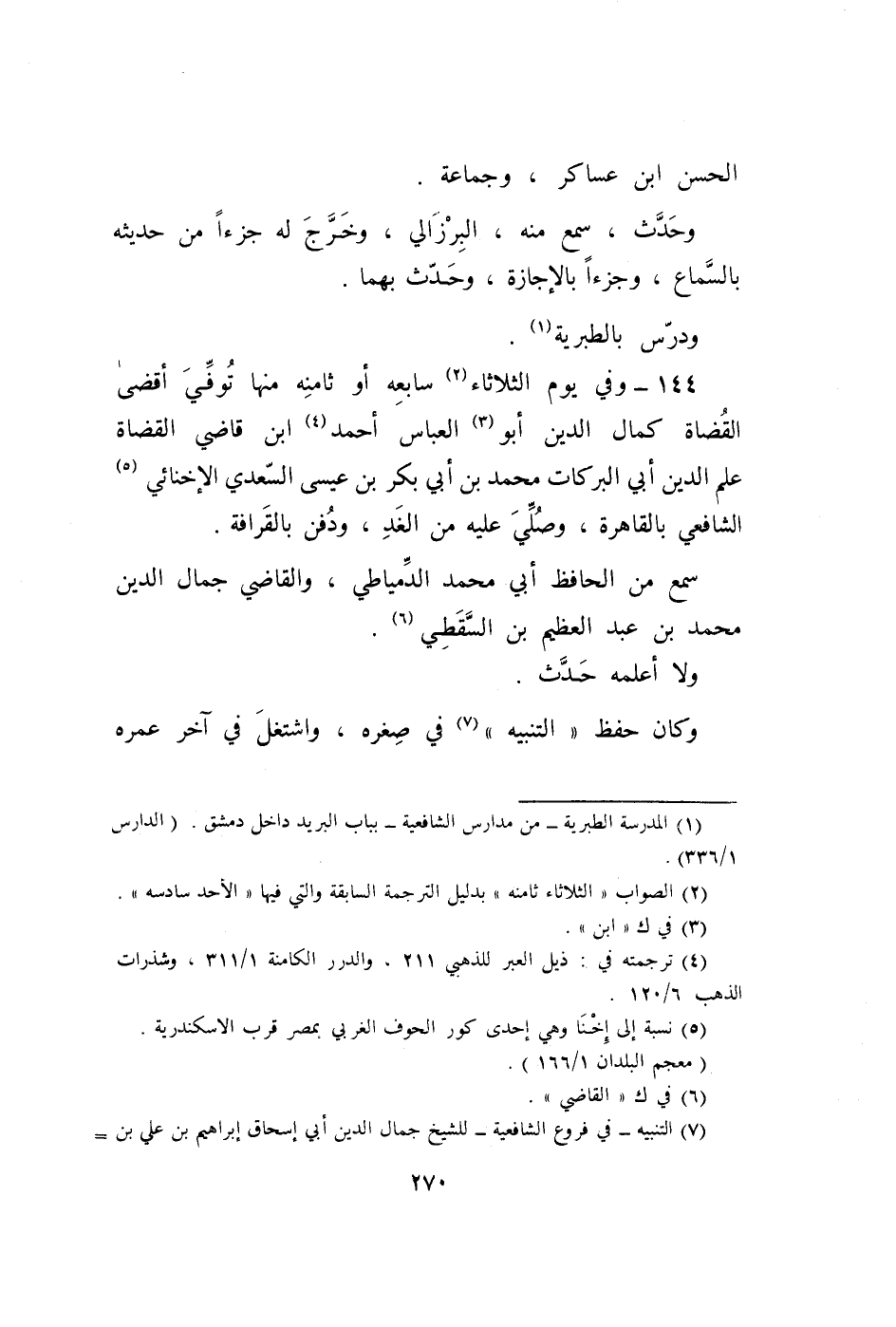 144 - وَفِي يَوْم الثُّلَاثَاء سابعه أَو ثامنه مِنْهَا توفّي أقضى الْقُضَاة كَمَال الدّين أَبُو الْعَبَّاس أَحْمد ابْن قَاضِي الْقُضَاة علم الدّين أبي البركات مُحَمَّد بن أبي بكر بن عِيسَى السَّعْدِيّ الإخنائي الشَّافِعِي بِالْقَاهِرَةِ وَصلي عَلَيْهِ من الْغَد وَدفن بالقرافة