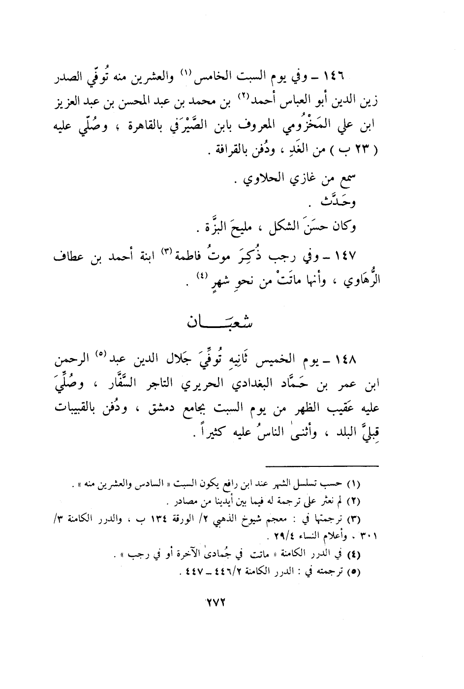 148 - يَوْم الْخَمِيس ثَانِيَة توفّي جلال الدّين عبد الرَّحْمَن ابْن عمر بن حَمَّاد الْبَغْدَادِيّ الحريري التَّاجِر السفار وَصلي عَلَيْهِ عقيب الظّهْر من يَوْم السبت بِجَامِع دمشق وَدفن بالقبيبات قبلي الْبَلَد وَأثْنى النَّاس عَلَيْهِ كثيرا