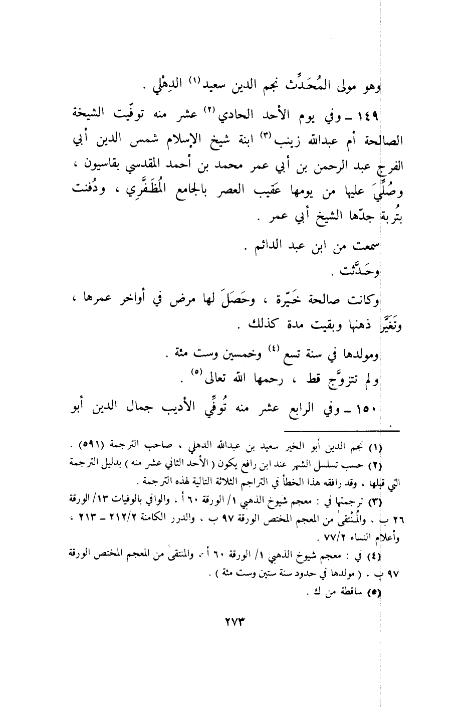 149 - وَفِي يَوْم الْأَحَد الْحَادِي عشر مِنْهُ توفيت الشيخة الصَّالِحَة أم عبد الله زَيْنَب ابْنة شيخ الْإِسْلَام شمس الدّين أبي الْفرج عبد الرَّحْمَن بن أبي عمر مُحَمَّد بن أَحْمد الْمَقْدِسِي بقاسيون وَصلي عَلَيْهَا من يَوْمهَا عقيب الْعَصْر بالجامع المظفري ودفنت بتربة جدها الشَّيْخ أبي عمر