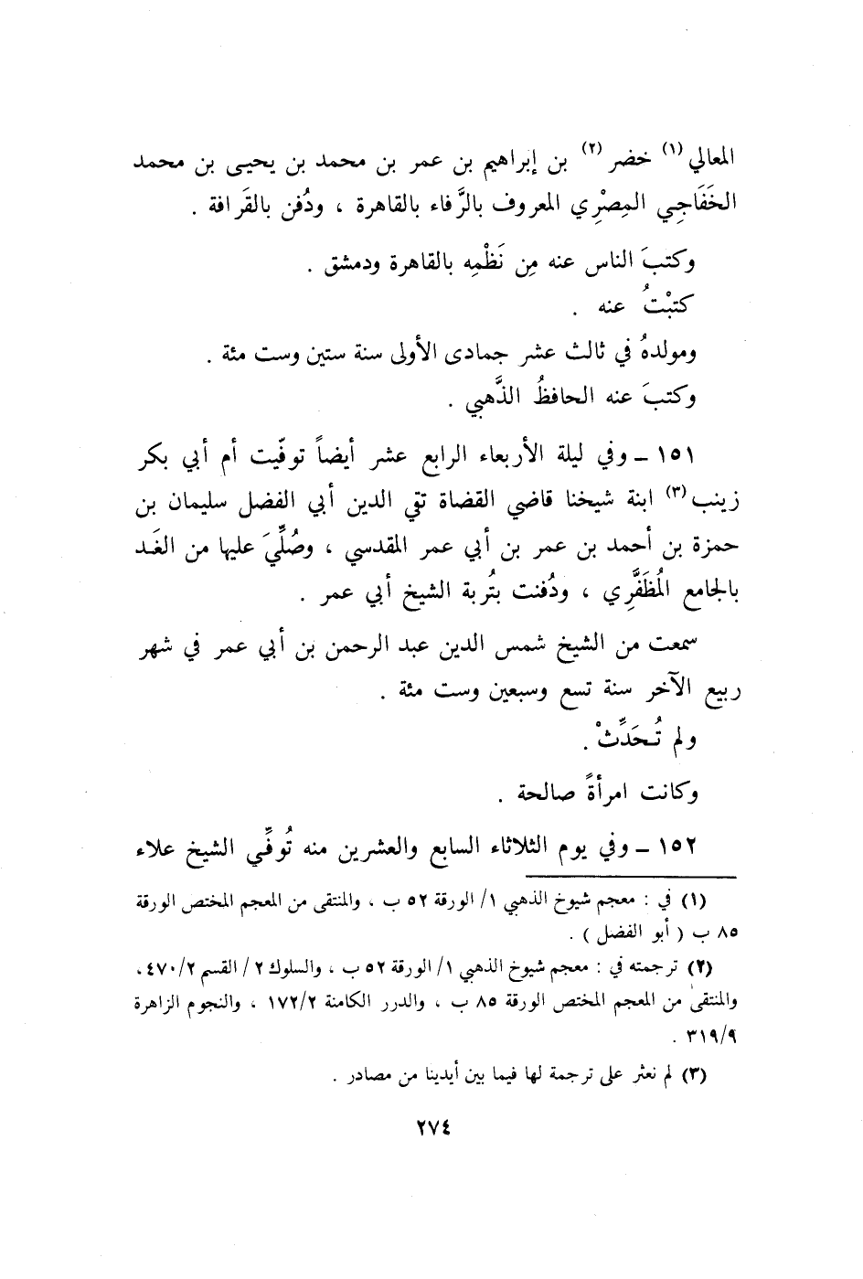 151 - وَفِي لَيْلَة الرَّابِع عشر أَيْضا توفيت أم أبي بكر زَيْنَب ابْنة شَيخنَا قَاضِي الْقُضَاة تَقِيّ الدّين أبي الْفضل سُلَيْمَان بن حَمْزَة بن أَحْمد بن عمر بن أبي عمر الْمَقْدِسِي وَصلي عَلَيْهَا من الْغَد بالجامع المظفري ودفنت بتربة الشَّيْخ أبي عمر