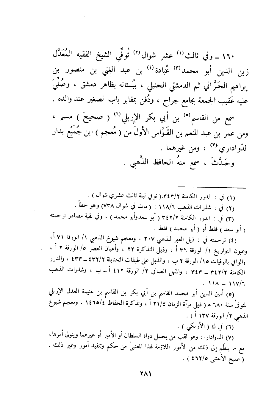 160 - وَفِي ثَالِث عشر شَوَّال توفّي الشَّيْخ الْفَقِيه الْمعدل زين الدّين أَبُو مُحَمَّد عبَادَة بن عبد الْغَنِيّ بن مَنْصُور بن إِبْرَاهِيم الْحَرَّانِي ثمَّ الدِّمَشْقِي الْحَنْبَلِيّ ببستانه بِظَاهِر دمشق وَصلي عَلَيْهِ عقيب الْجُمُعَة بِجَامِع جراح وَدفن بمقابر بَاب الصَّغِير عِنْد وَالِده