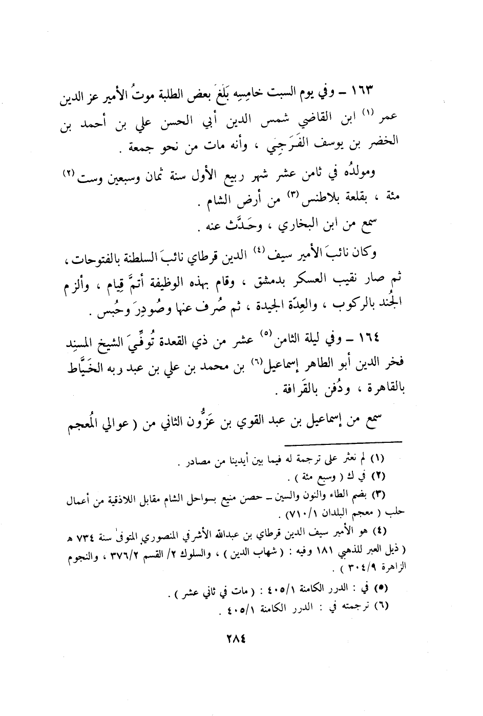 163 - وَفِي يَوْم السبت خامسه بلغ بعض الطّلبَة موت الْأَمِير عز الدّين عمر بن القَاضِي شمس الدّين أبي الْحسن عَليّ بن أَحْمد بن الْخضر بن يُوسُف الْفَرَجِيِّ وَأَنه مَاتَ من نَحْو جُمُعَة