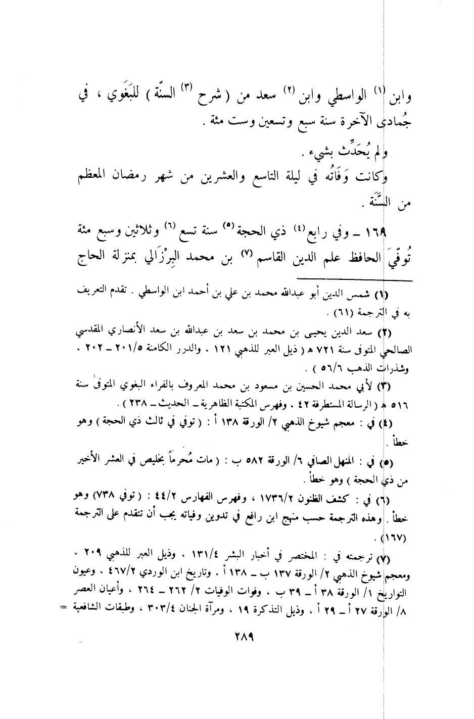 169 - وَفِي رَابِع ذِي الْحجَّة سنة تسع وَثَلَاثِينَ وَسبع مئة توفّي الْحَافِظ علم الدّين الْقَاسِم بن مُحَمَّد البرزالي بِمَنْزِلَة الْحَاج