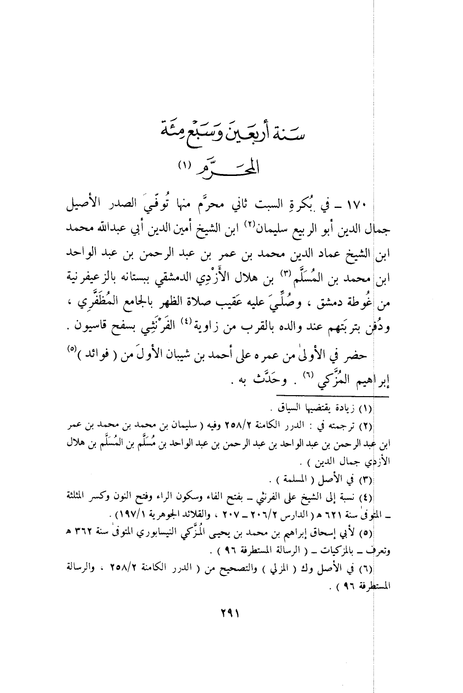 170 - فِي بكرَة السبت ثَانِي محرم مِنْهَا توفّي الصَّدْر الْأَصِيل جمال الدّين أَبُو الرّبيع سُلَيْمَان بن الشَّيْخ أَمِين الدّين أبي عبد الله مُحَمَّد بن الشَّيْخ عماد الدّين مُحَمَّد بن عمر بن عبد الرَّحْمَن بن عبد الْوَاحِد بن مُحَمَّد بن الْمُسلم بن هِلَال الْأَزْدِيّ الدِّمَشْقِي ببستانه بالزعيفرنية من غوطة دمشق وَصلي عَلَيْهِ عقيب صَلَاة الظّهْر بالجامع المظفري وَدفن بتربتهم عِنْد وَالِده بِالْقربِ من زَاوِيَة الفرنثي بسفح قاسيون