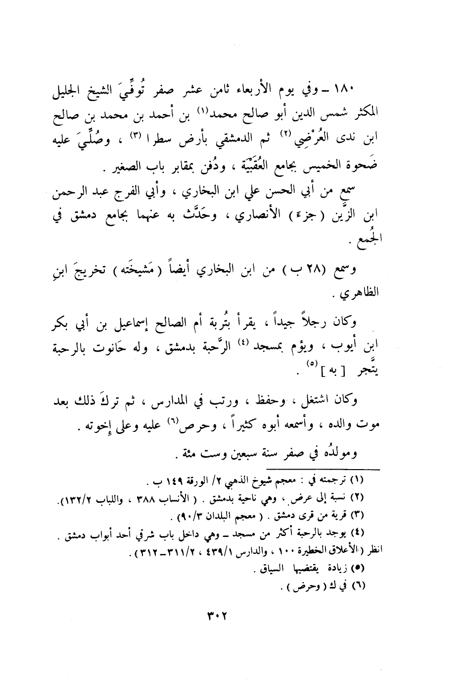 180 - وَفِي يَوْم الْأَرْبَعَاء ثامن عشر صفر توفّي الشَّيْخ الْجَلِيل المكثر شمس الدّين أَبُو صَالح مُحَمَّد بن أَحْمد بن مُحَمَّد بن صَالح بن ندى العرضي ثمَّ الدِّمَشْقِي بِأَرْض سطرا وَصلي عَلَيْهِ ضحوة الْخَمِيس بِجَامِع العقبية وَدفن بمقابر بَاب الصَّغِير