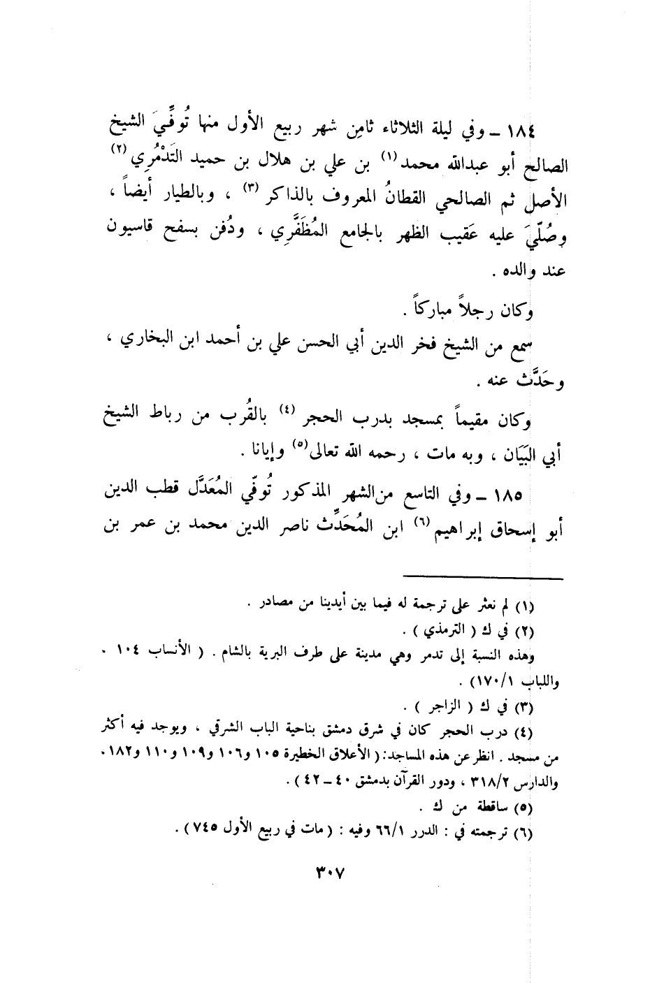 184 - وَفِي لَيْلَة الثُّلَاثَاء ثامن شهر ربيع الأول مِنْهَا توفّي الشَّيْخ الصَّالح أَبُو عبد الله مُحَمَّد بن عَليّ بن هِلَال بن حميد التدمري الأَصْل ثمَّ الصَّالِحِي الْقطَّان الْمَعْرُوف بالذاكر وبالطيار ايضا وَصلي عَلَيْهِ عقيب الظّهْر بالجامع المظفري وَدفن بسفح قاسيون عِنْد وَالِده