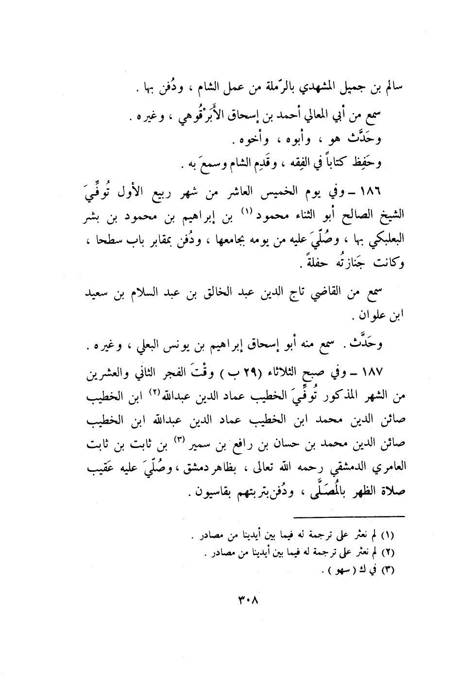 186 - وَفِي يَوْم الْخَمِيس الْعَاشِر من شهر ربيع الأول توفّي الشَّيْخ الصَّالح أَبُو الثَّنَاء مَحْمُود بن إِبْرَاهِيم بن مَحْمُود بن بشر البعلبكي بهَا وَصلي عَلَيْهِ من يَوْمه بجامعها وَدفن بمقابر بَاب سطحا وَكَانَت جنَازَته حفلة
