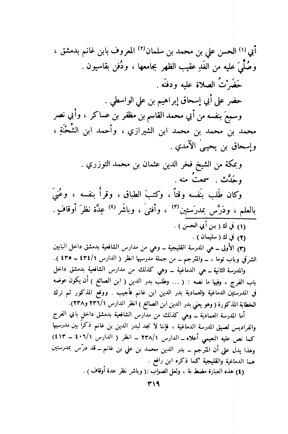 أبي الْحسن عَليّ بن مُحَمَّد بن سلمَان الْمَعْرُوف بِابْن غَانِم بِدِمَشْق وَصلي عَلَيْهِ من الْغَد عقيب الظّهْر بجامعها وَدفن بقاسيون