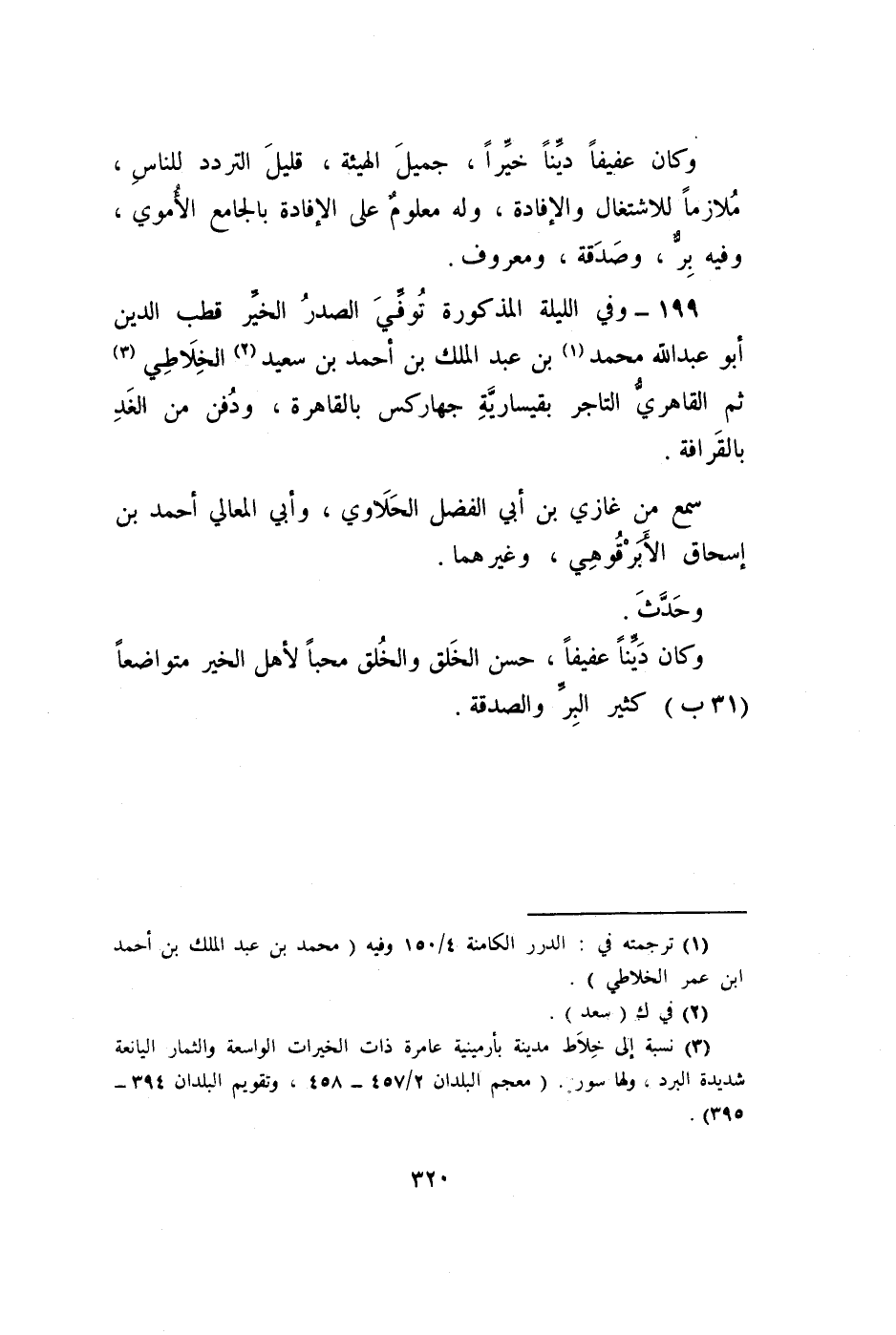199 - وَفِي اللَّيْلَة الْمَذْكُورَة توفّي الصَّدْر الْخَيْر قطب الدّين أَبُو عبد الله مُحَمَّد ابْن عبد الْملك بن احْمَد بن سعيد الخلاطي ثمَّ القاهري التَّاجِر بقيسارية جهاركس بِالْقَاهِرَةِ وَدفن من الْغَد بالقرافة