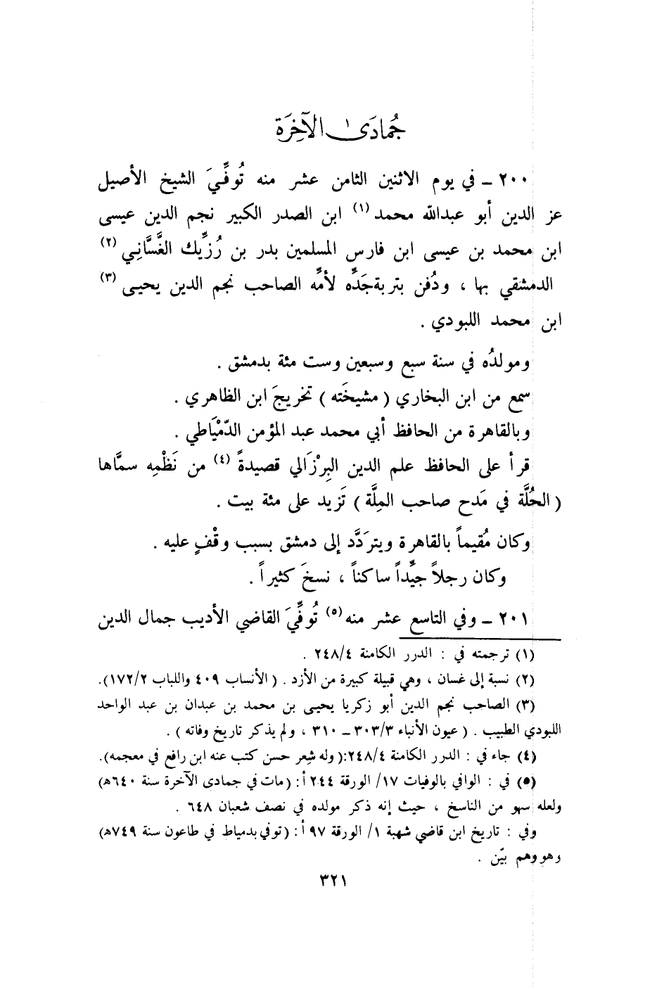 200 - فِي يَوْم الِاثْنَيْنِ الثَّامِن عشر مِنْهُ توفّي الشَّيْخ الْأَصِيل عز الدّين أَبُو عبد الله مُحَمَّد ابْن الصَّدْر الْكَبِير نجم الدّين عِيسَى ابْن مُحَمَّد بن عِيسَى ابْن فَارس الْمُسلمين بدر بن رزيك الغساني الدِّمَشْقِي بهَا وَدفن بتربة جده لأمه الصاحب نجم الدّين يحيى ابْن مُحَمَّد اللبودي