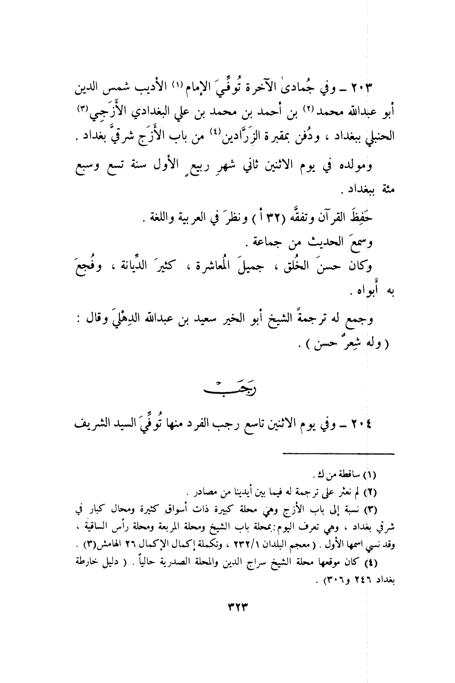 203 - وَفِي جُمَادَى الْآخِرَة توفّي الإِمَام الأديب شمس الدّين أَبُو عبد الله مُحَمَّد ابْن أَحْمد بن مُحَمَّد بن عَليّ الْبَغْدَادِيّ الْأَزجيّ الْحَنْبَلِيّ ببغدد وَدفن بمقبرة الزرادين من بَاب الأزج شَرْقي بَغْدَاد