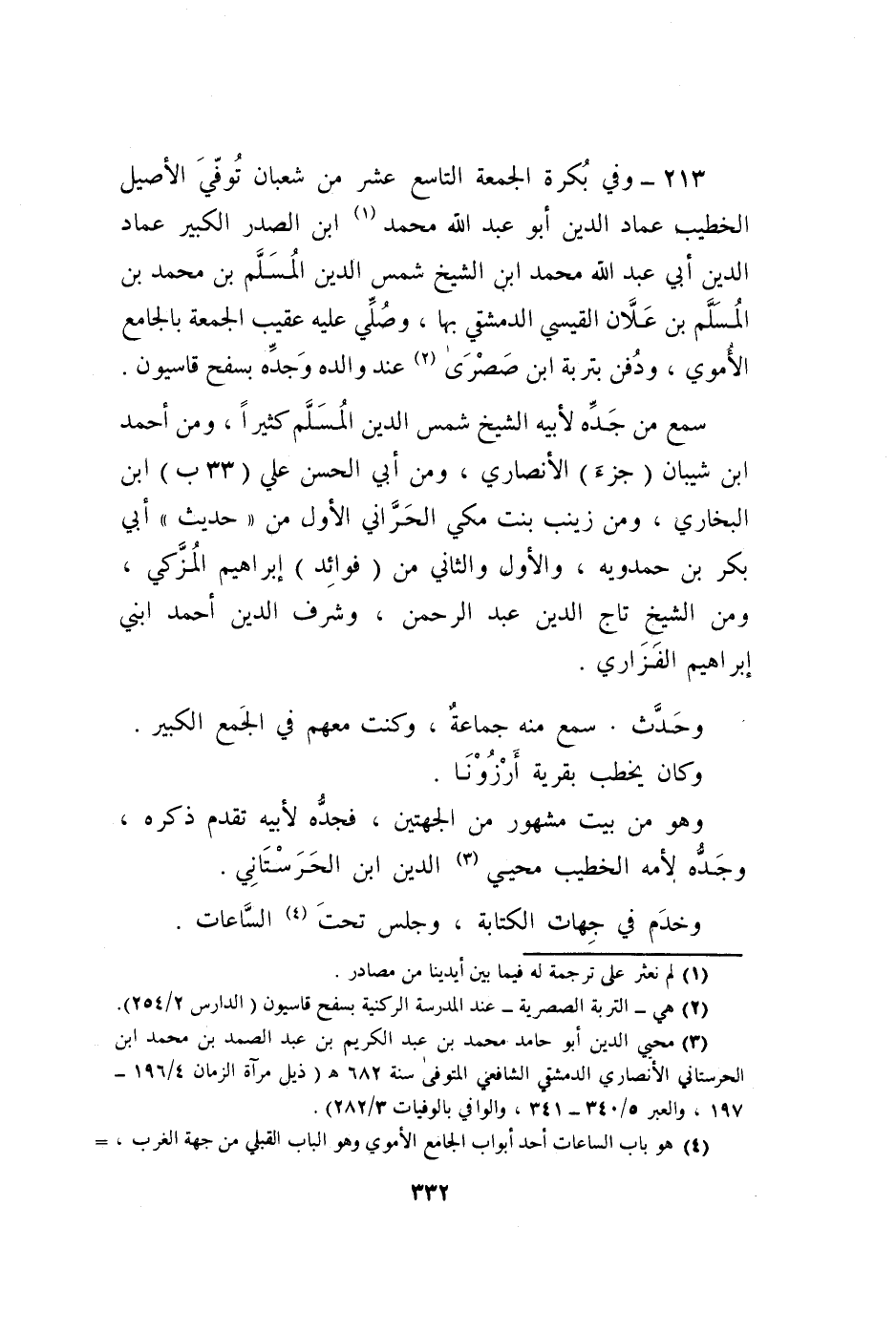 213 - وَفِي بكرَة الْجُمُعَة التَّاسِع عشر من شعْبَان توفّي الْأَصِيل الْخَطِيب عماد الدّين أَبُو عبد الله مُحَمَّد بن الصَّدْر الْكَبِير عماد الدّين أبي عبد الله مُحَمَّد ابْن الشَّيْخ شمس الدّين الْمُسلم بن مُحَمَّد بن الْمُسلم بن عَلان الْقَيْسِي الدِّمَشْقِي بهَا وَصلي عَلَيْهِ عقيب الْجُمُعَة بالجامع الْأمَوِي وَدفن بتربة ابْن صصري عِنْد وَالِده وجده بسفح قاسيون