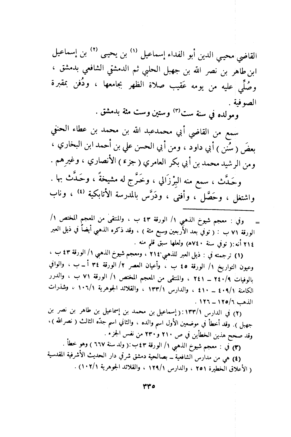 القَاضِي محيي الدّين أَبُو الْفِدَاء إِسْمَاعِيل بن يحي بن إِسْمَاعِيل بن طَاهِر ابْن نصر الله بن جهبل الْحلَبِي ثمَّ الدِّمَشْقِي الشَّافِعِي بِدِمَشْق وَصلي عَلَيْهِ من يَوْمه عقيب صَلَاة الظّهْر بجامعها وَدفن بمقبرة الصُّوفِيَّة