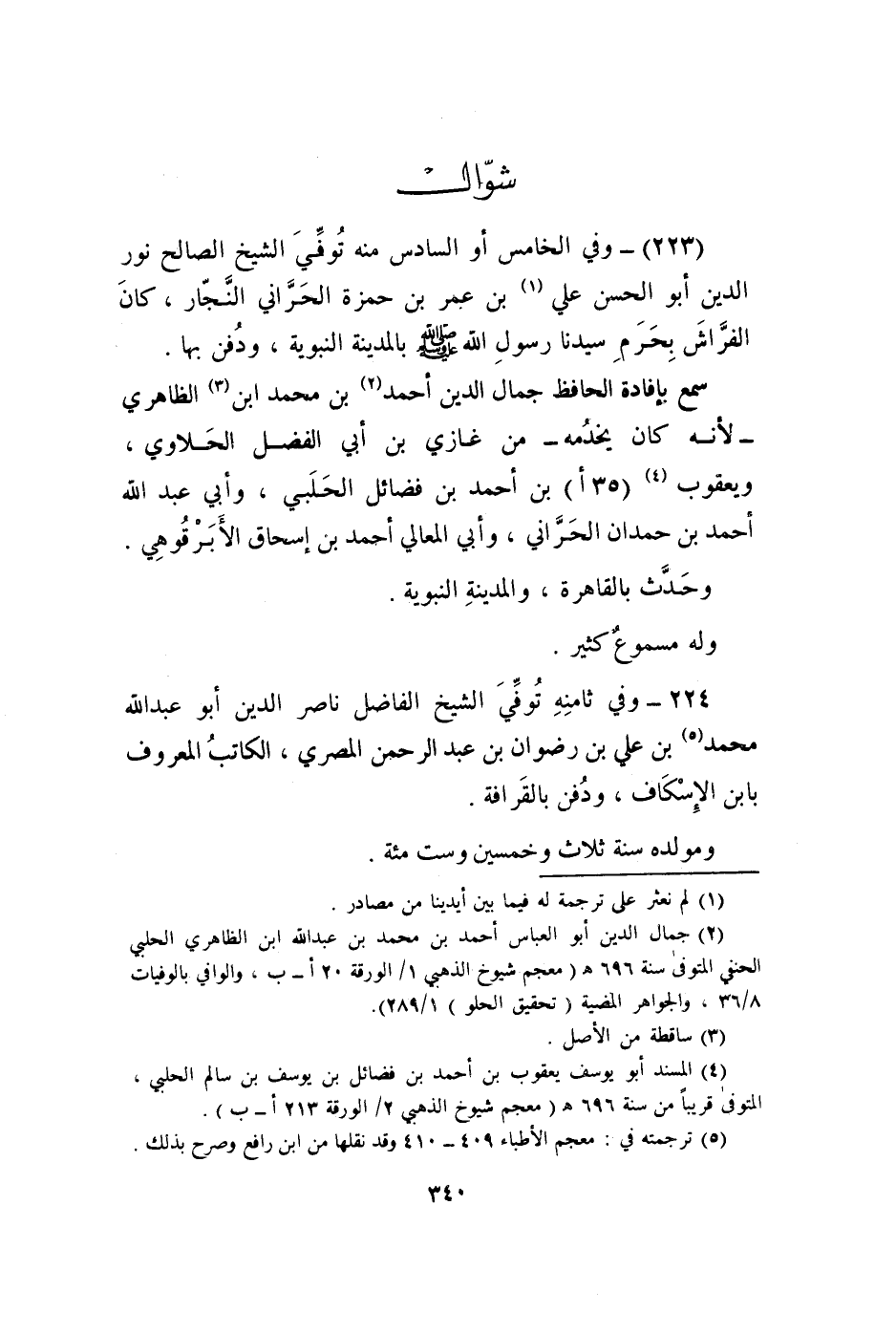 223 - وَفِي الْخَامِس أَو السَّادِس مِنْهُ توفّي الشَّيْخ الصَّالح نور الدّين ابو الْحسن عَليّ بن عمر بن حَمْزَة الْحَرَّانِي النجار كَانَ الْفراش بحرم سيدنَا رَسُول الله صلى الله عَلَيْهِ وَسلم بِالْمَدِينَةِ النَّبَوِيَّة وَدفن بهَا