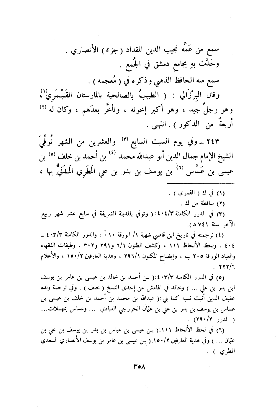 243 - وَفِي يَوْم السبت السَّابِع وَالْعِشْرين من الشَّهْر توفّي الشَّيْخ الإِمَام جمال الدّين ابو عبد الله مُحَمَّد بن أَحْمد بن خلف بن عِيسَى بن عساس بن يُوسُف ابْن بدر بن عَليّ المطري الْمدنِي بهَا