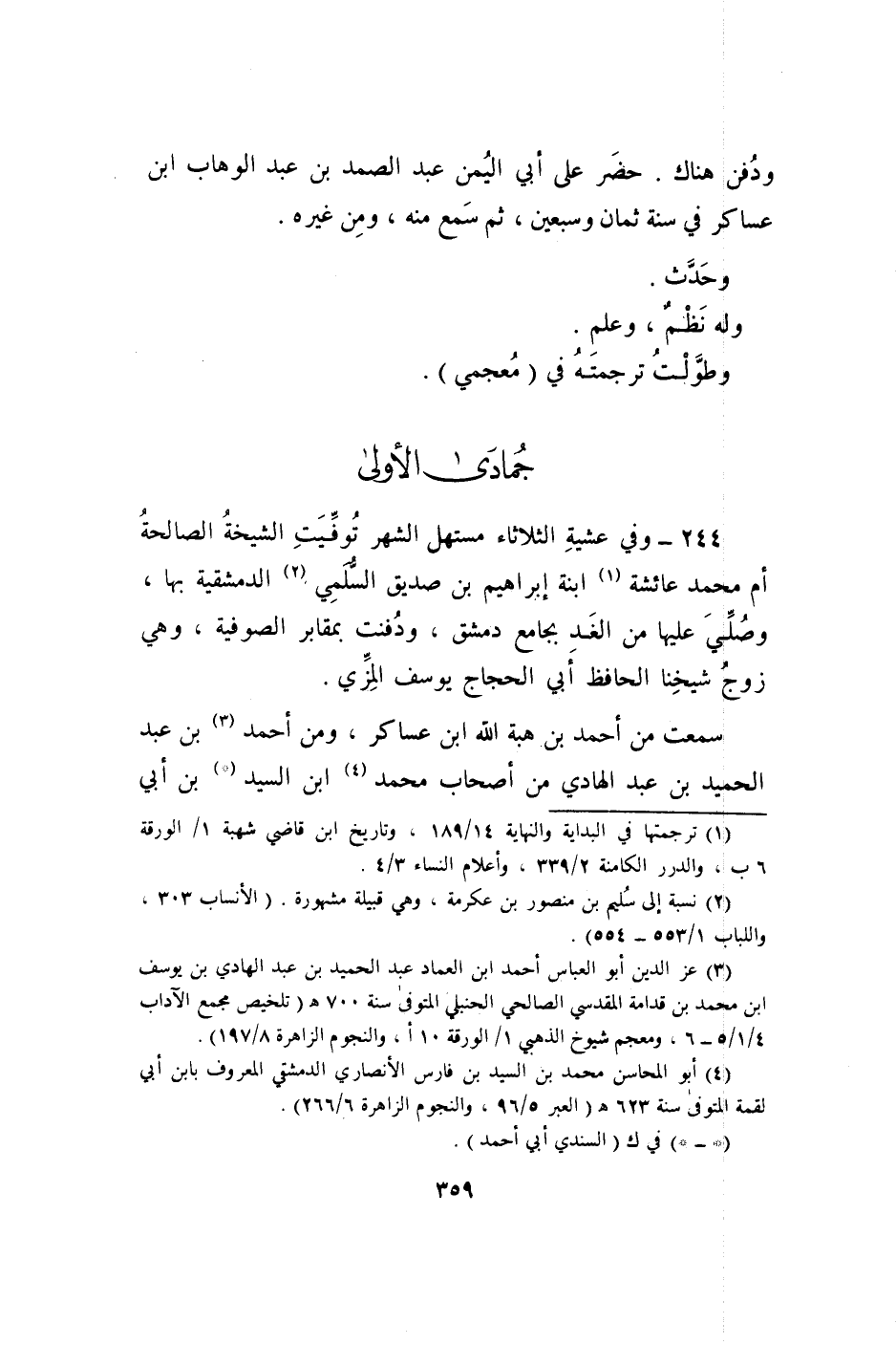 244 - وَفِي عَشِيَّة الثُّلَاثَاء مستهل الشَّهْر توفيت الشيخة الصَّالِحَة أم مُحَمَّد عَائِشَة ابْنة إِبْرَاهِيم بن صديق السّلمِيّ الدمشقية بهَا وَصلي عَلَيْهَا من الْغَد بِجَامِع دمشق ودفنت بمقابر الصُّوفِيَّة وَهِي زوج شَيخنَا الْحَافِظ ابي الْحجَّاج يُوسُف الْمزي