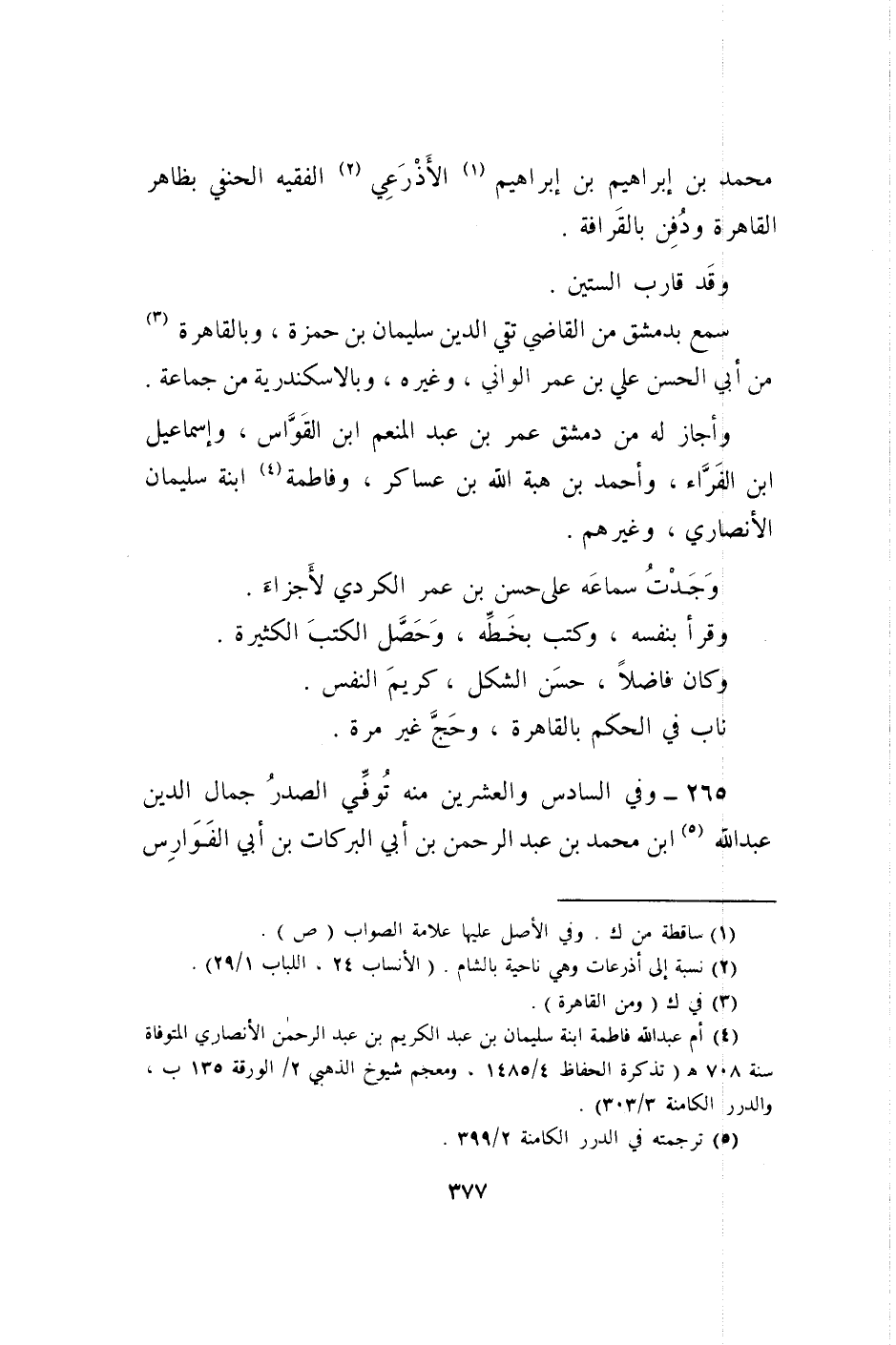 مُحَمَّد بن إِبْرَاهِيم بن إِبْرَاهِيم الْأَذْرَعِيّ الْفَقِيه الْحَنَفِيّ بِظَاهِر الْقَاهِرَة وَدفن بالقرافة