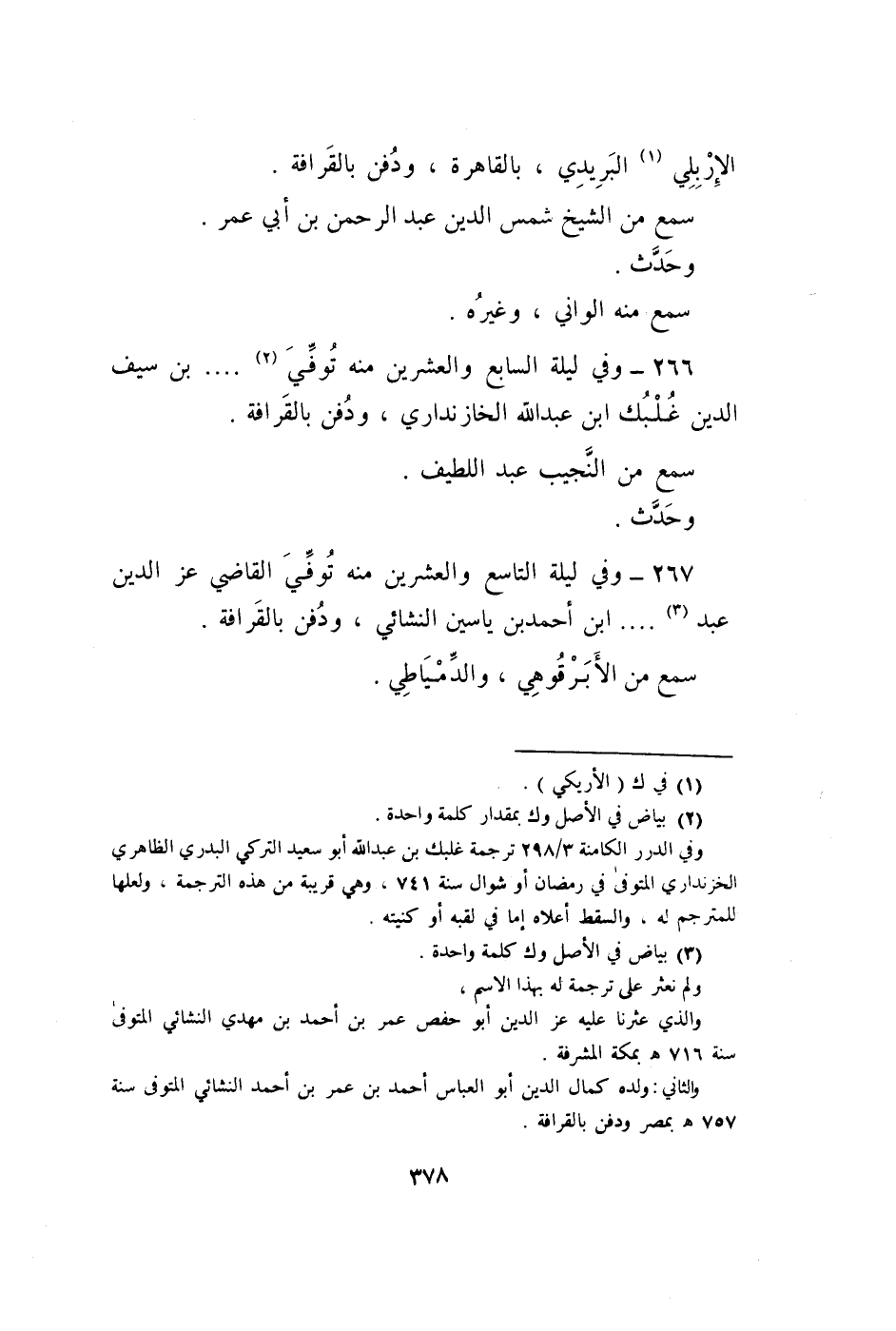 267 - وَفِي لَيْلَة التَّاسِع وَالْعِشْرين مِنْهُ توفّي القَاضِي عز الدّين عبد ابْن أَحْمد ابْن ياسين النشائي وَدفن بالقرافة