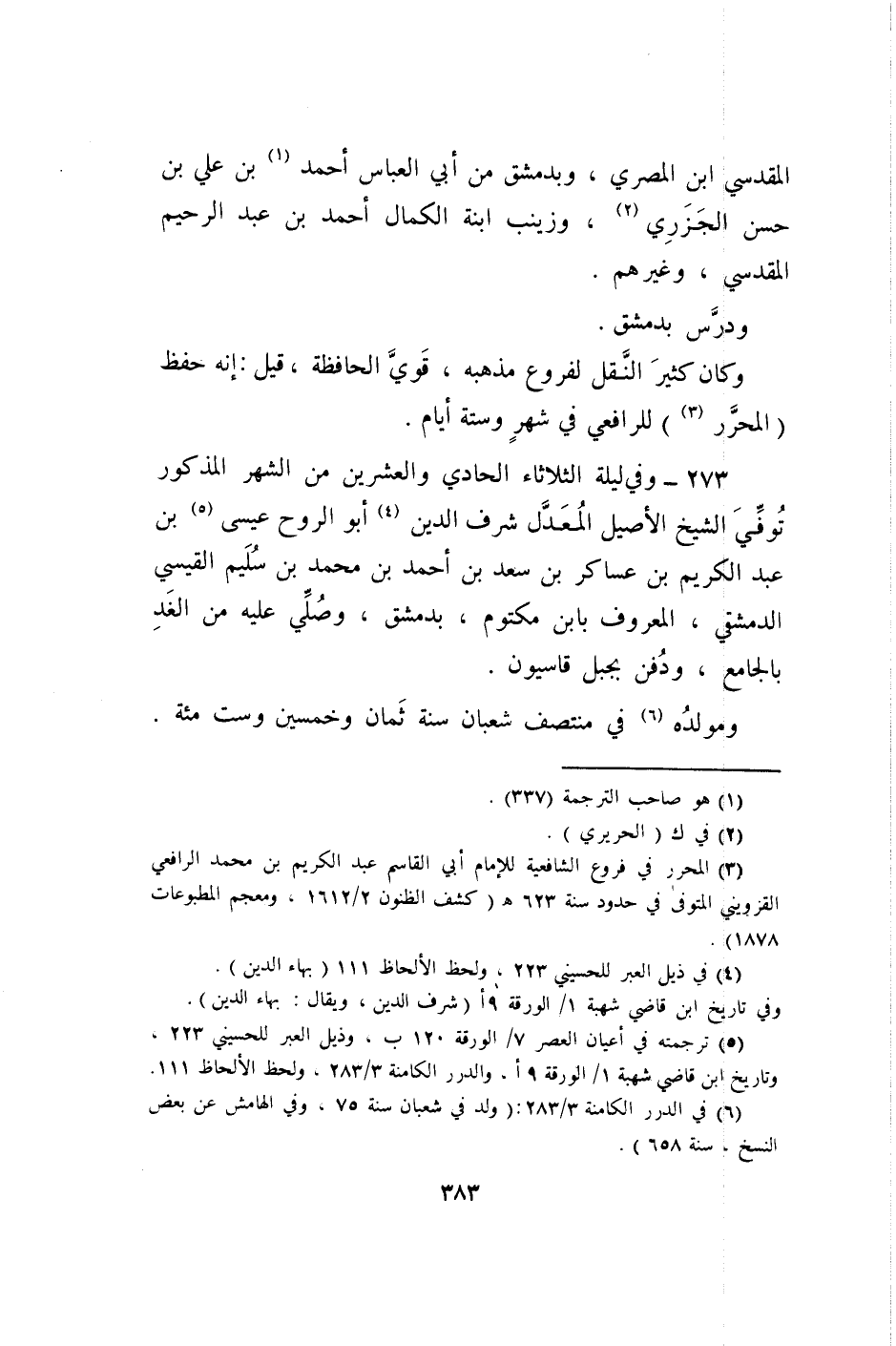 273 - وَفِي لَيْلَة الثُّلَاثَاء الْحَادِي وَالْعِشْرين من الشَّهْر الْمَذْكُور توفّي الشَّيْخ الْأَصِيل الْمعدل شرف الدّين أَبُو الرّوح عِيسَى بن عبد الْكَرِيم بن عَسَاكِر ابْن سعد بن أَحْمد بن مُحَمَّد بن سليم الْقَيْسِي الدِّمَشْقِي الْمَعْرُوف بِابْن مَكْتُوم بِدِمَشْق وَصلي عَلَيْهِ من الْغَد بالجامع وَدفن بجبل قاسيون