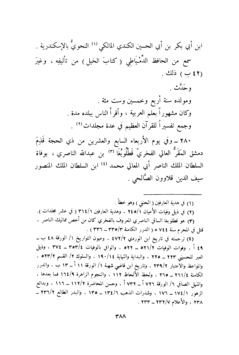 280 - وَفِي يَوْم الْأَرْبَعَاء السَّابِع وَالْعِشْرين من ذِي الْحجَّة قدم دمشق الْمقر العالي الفخري قطلوبغا بن عبد الله الناصري بوفاة السُّلْطَان الْملك النَّاصِر أبي الْمَعَالِي مُحَمَّد ابْن السُّلْطَان الْملك الْمَنْصُور سيف الدّين قلاوون الصَّالِحِي