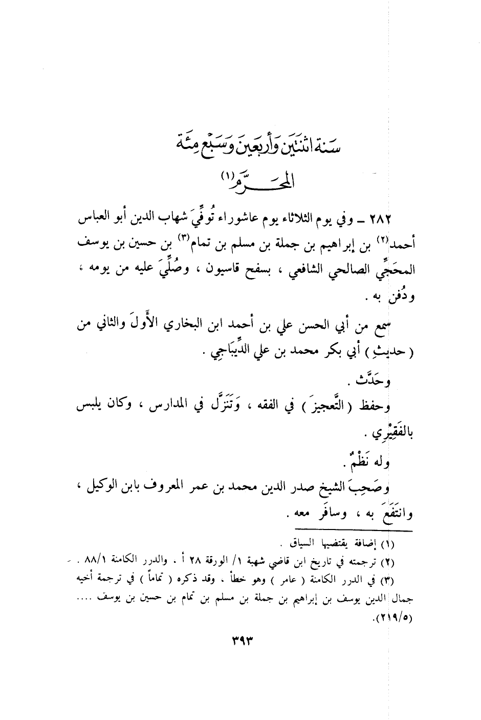 282 - وَفِي يَوْم الثُّلَاثَاء يَوْم عَاشُورَاء توفّي شهَاب الدّين أَبُو الْعَبَّاس أَحْمد بن إِبْرَاهِيم بن جملَة بن مُسلم بن تَمام بن حُسَيْن بن يُوسُف المحجي الصَّالِحِي الشَّافِعِي بسفح قاسيون وَصلي عَلَيْهِ من يَوْمه وَدفن بِهِ