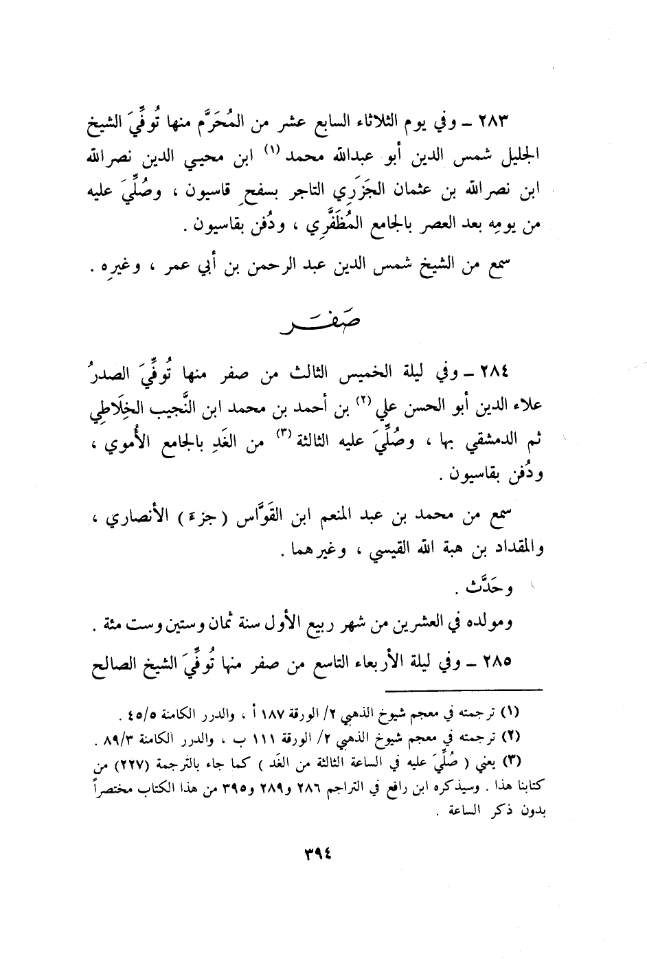 283 - وَفِي يَوْم الثُّلَاثَاء السَّابِع عشر من الْمحرم مِنْهَا توفّي الشَّيْخ الْجَلِيل شمس الدّين أَبُو عبد الله مُحَمَّد بن محيي الدّين نصر الله بن نصر الله ابْن عُثْمَان الْجَزرِي التَّاجِر بسفح قاسيون وَصلي عَلَيْهِ من يَوْمه بعد الْعَصْر بالجامع المظفري وَدفن بقاسيون