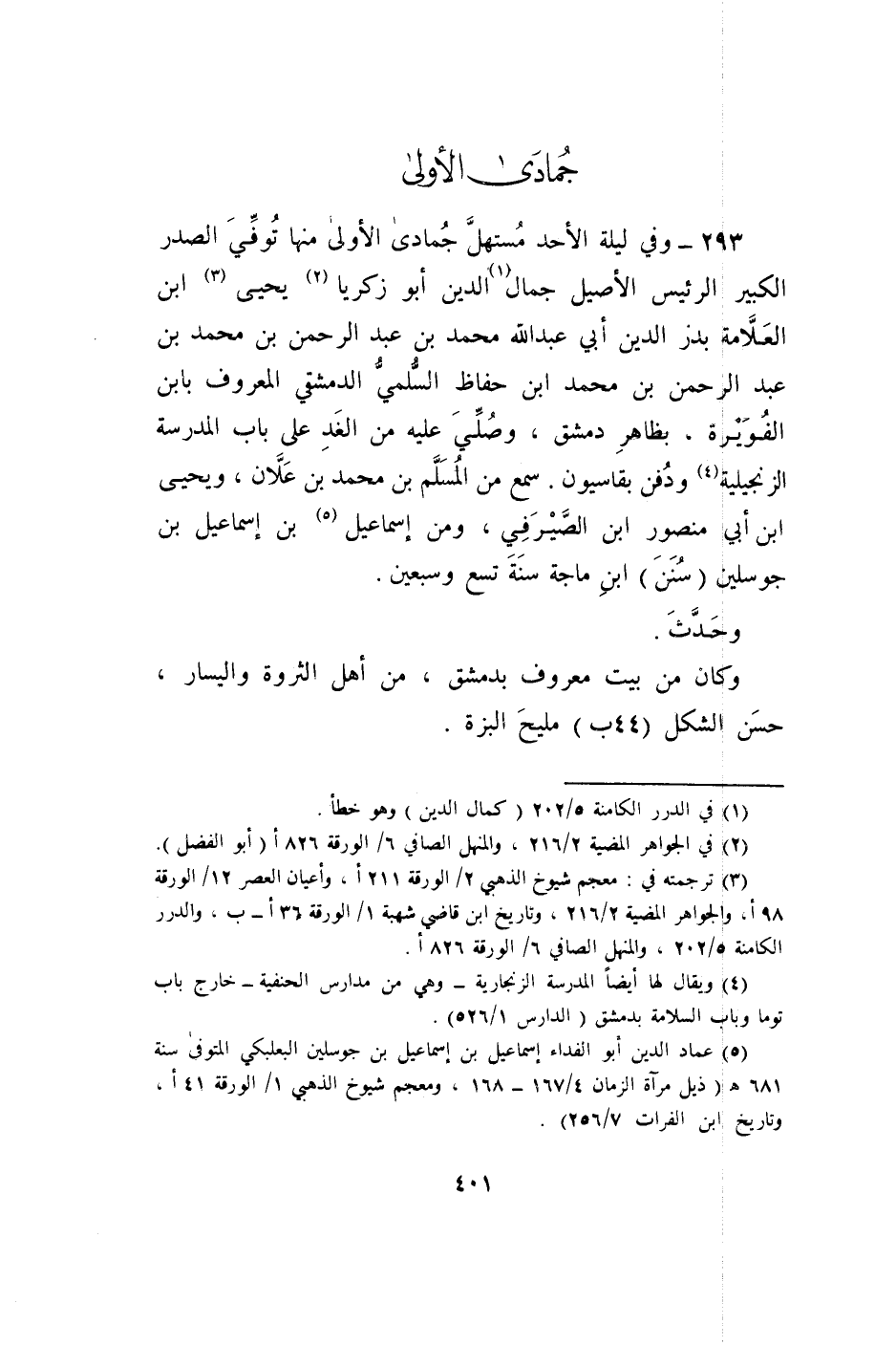 293 - وَفِي لَيْلَة الْأَحَد مستهل جُمَادَى الأولى مِنْهَا توفّي الصَّدْر الْكَبِير الرئيس الْأَصِيل جمال الدّين أَبُو زَكَرِيَّا يحيى ابْن الْعَلامَة بدر الدّين أبي عبد الله مُحَمَّد بن عبد الرَّحْمَن بن مُحَمَّد بن عبد الرَّحْمَن بن مُحَمَّد بن حفاظ السّلمِيّ الدِّمَشْقِي الْمَعْرُوف بِابْن الفويرة بِظَاهِر دمشق وَصلي عَلَيْهِ من الْغَد على بَاب الْمدرسَة الزنجيلية وَدفن بقاسيون سمع من الْمُسلم بن مُحَمَّد بن عَلان وَيحيى بن أبي مَنْصُور بن الصَّيْرَفِي وَمن إِسْمَاعِيل بن إِسْمَاعِيل بن جوسلين سنَن ابْن ماجة سنة تسع وَسبعين