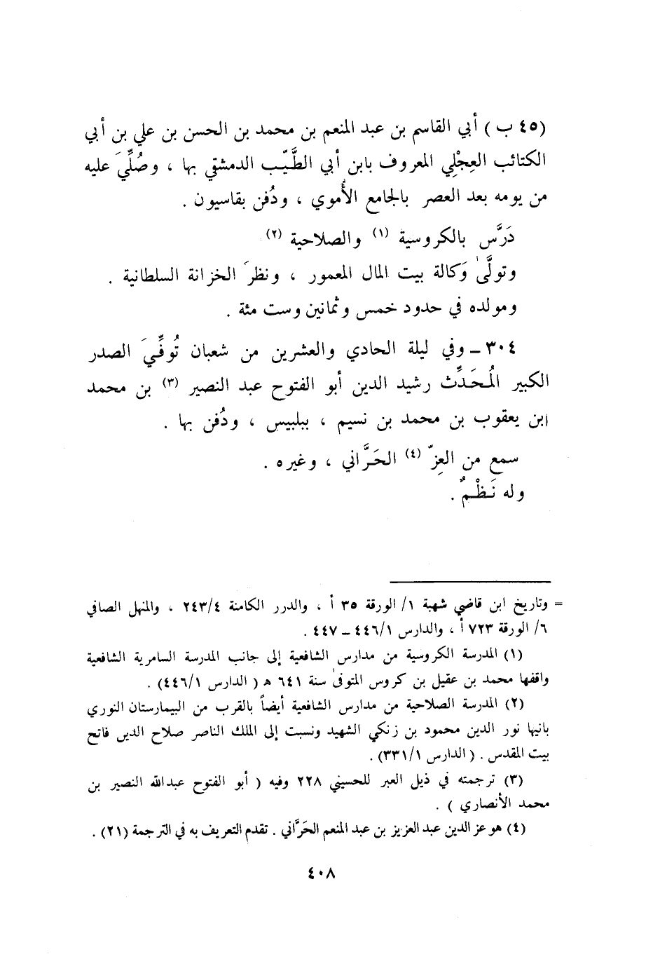 304 - وَفِي لَيْلَة الحادى وَالْعِشْرين من شعْبَان توفّي الصَّدْر الْكَبِير الْمُحدث رشيد الدّين أَبُو الْفتُوح عبد النصير بن مُحَمَّد بن يَعْقُوب بن مُحَمَّد بن نسيم ببلبيس وَدفن بهَا