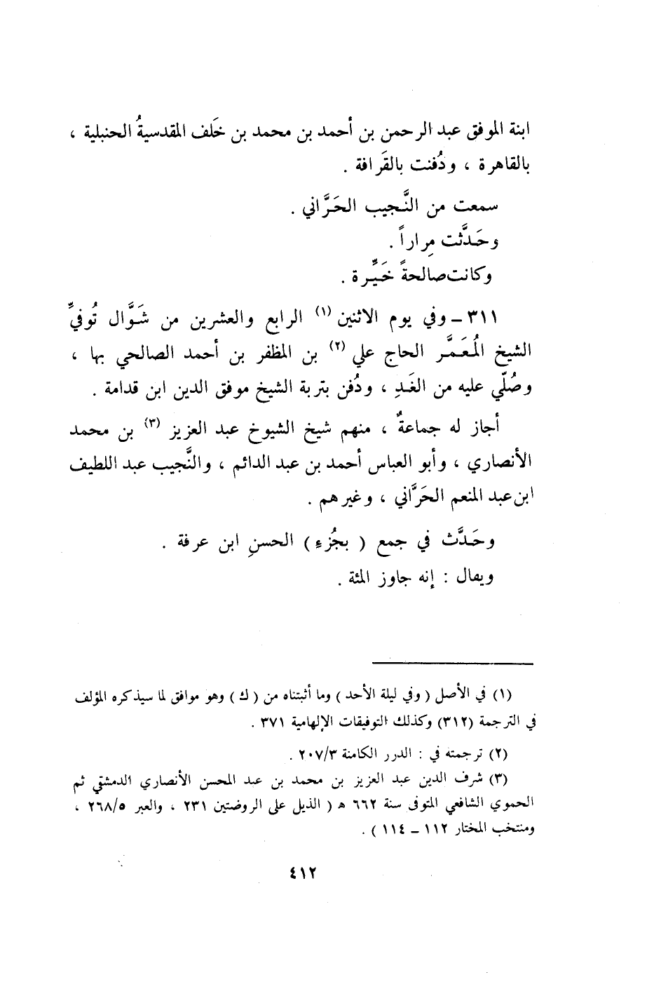 311 - وَفِي يَوْم الِاثْنَيْنِ الرَّابِع وَالْعِشْرين من شَوَّال توفّي الشَّيْخ المعمر الْحَاج عَليّ بن المظفر بن أَحْمد الصَّالِحِي بهَا وَصلي عَلَيْهِ من الْغَد وَدفن بتربة الشَّيْخ موفق الدّين ابْن قدامَة