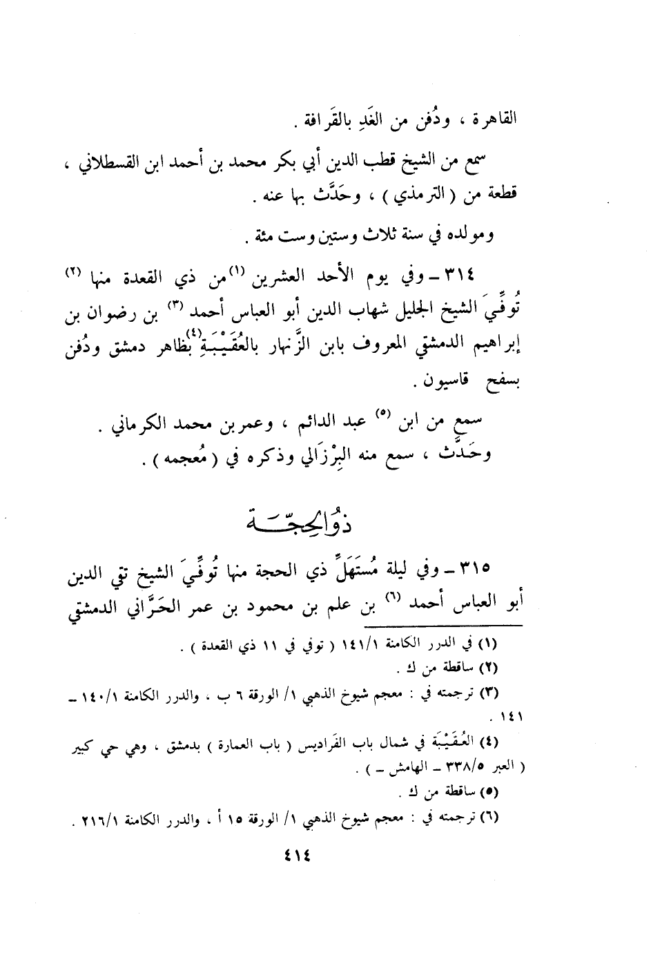 315 - وَفِي لَيْلَة مستهل ذِي الْحجَّة مِنْهَا توفّي الشَّيْخ تَقِيّ الدّين أَبُو الْعَبَّاس أَحْمد بن علم بن مَحْمُود بن عمر الْحَرَّانِي الدِّمَشْقِي