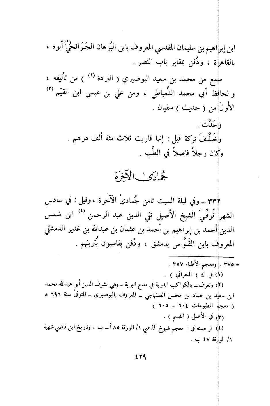 332 - وَفِي لَيْلَة السبت ثامن جُمَادَى الْآخِرَة وَقيل فِي سادس الشَّهْر توفّي الشَّيْخ الْأَصِيل تَقِيّ الدّين عبد الرَّحْمَن بن شمس الدّين أَحْمد بن إِبْرَاهِيم بن أَحْمد بن عُثْمَان بن عبد الله بن غَدِير الدِّمَشْقِي الْمَعْرُوف بِابْن القواس بِدِمَشْق وَدفن بقاسيون بتربتهم