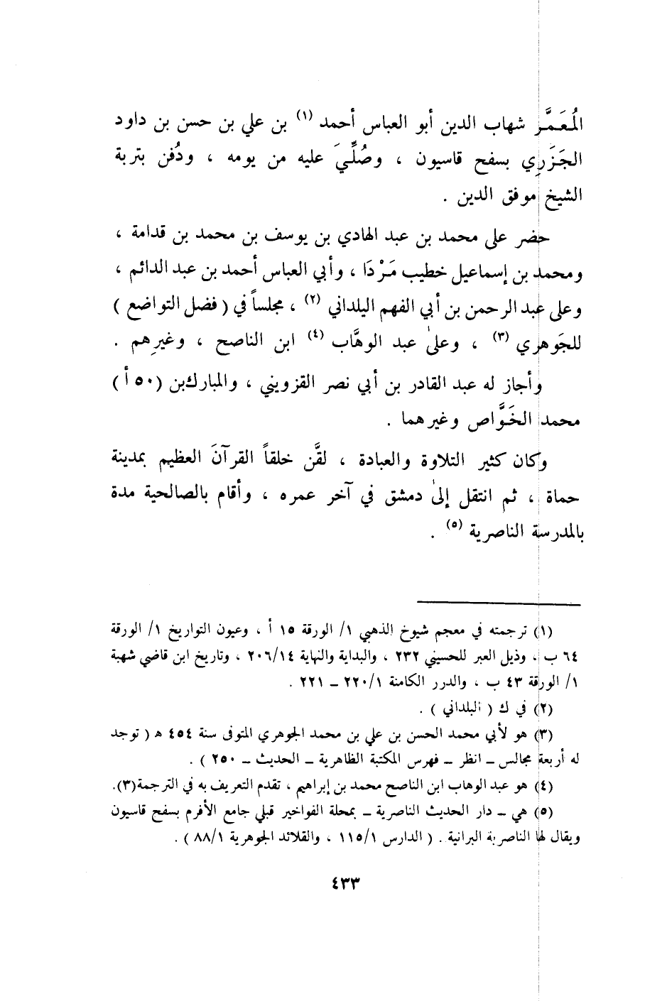 المعمر شهَاب الدّين أَبُو الْعَبَّاس أَحْمد بن عَليّ بن حسن بن دَاوُد الْجَزرِي بسفح قاسيون وَصلي عَلَيْهِ من يَوْمه وَدفن بتربة الشَّيْخ موفق الدّين