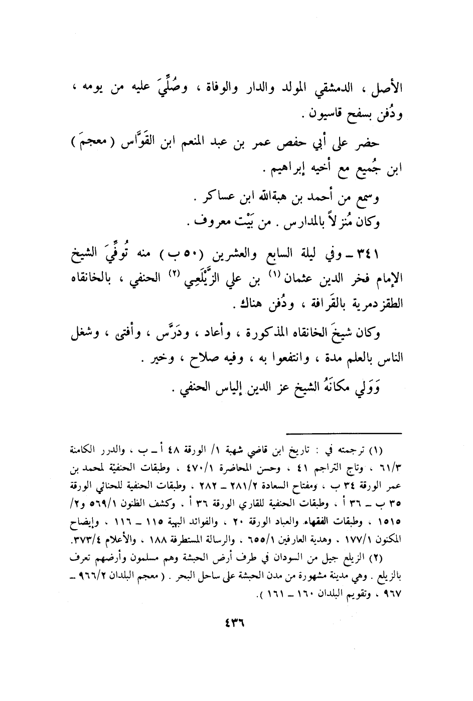 341 - وَفِي لَيْلَة السَّابِع وَالْعِشْرين (50 ب) مِنْهُ توفّي الشَّيْخ الإِمَام فَخر الدّين عُثْمَان بن عَليّ الزَّيْلَعِيّ الْحَنَفِيّ بالخانقاه الطقزدمرية بالقرافة وَدفن هُنَاكَ