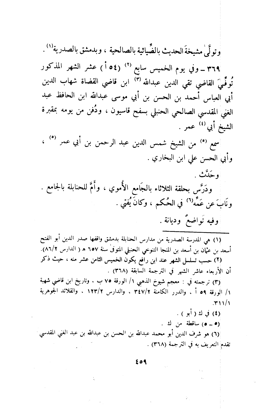 369 - وَفِي يَوْم الْخَمِيس سَابِع (54 أ) عشر الشَّهْر الْمَذْكُور توفّي القَاضِي تَقِيّ الدّين عبد الله ابْن قَاضِي الْقُضَاة شهَاب الدّين أبي الْعَبَّاس أَحْمد بن الْحسن بن أبي مُوسَى عبد الله ابْن الْحَافِظ عبد الْغَنِيّ الْمَقْدِسِي الصَّالِحِي الْحَنْبَلِيّ بسفح قاسيون وَدفن من يَوْمه بمقبرة الشَّيْخ أبي عمر