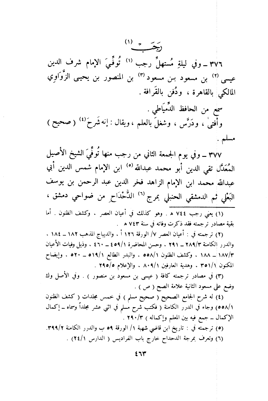 - رَجَب وَفِي لَيْلَة مستهل رَجَب توفّي الإِمَام شرف الدّين عِيسَى بن مَسْعُود بن مَسْعُود بن الْمَنْصُور بن يحيى الزواوي الْمَالِكِي