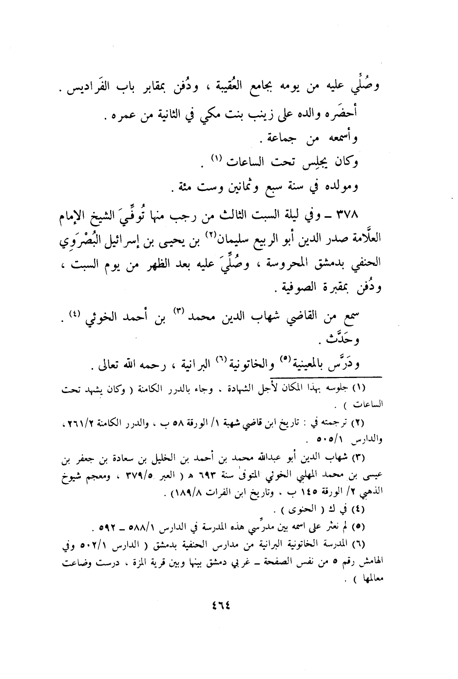 378 - وَفِي لَيْلَة السبت الثَّالِث من رَجَب مِنْهَا توفّي الشَّيْخ الإِمَام الْعَلامَة صدر الدّين أَبُو الرّبيع سُلَيْمَان بن يحيى بن إِسْرَائِيل البصروي الْحَنَفِيّ بِدِمَشْق المحروسة وَصلي عَلَيْهِ بعد الظّهْر من يَوْم السبت وَدفن بمقبرة الصُّوفِيَّة