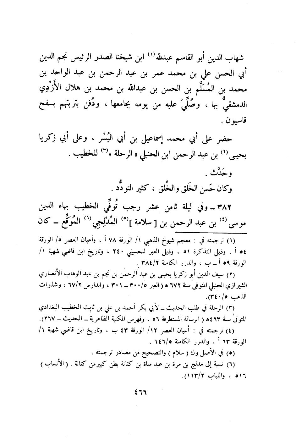 382 - وَفِي لَيْلَة ثامن عشر رَجَب توفّي الْخَطِيب بهاء الدّين مُوسَى بن عبد الرَّحْمَن بن سَلامَة المدلجي الْموقع كَانَ