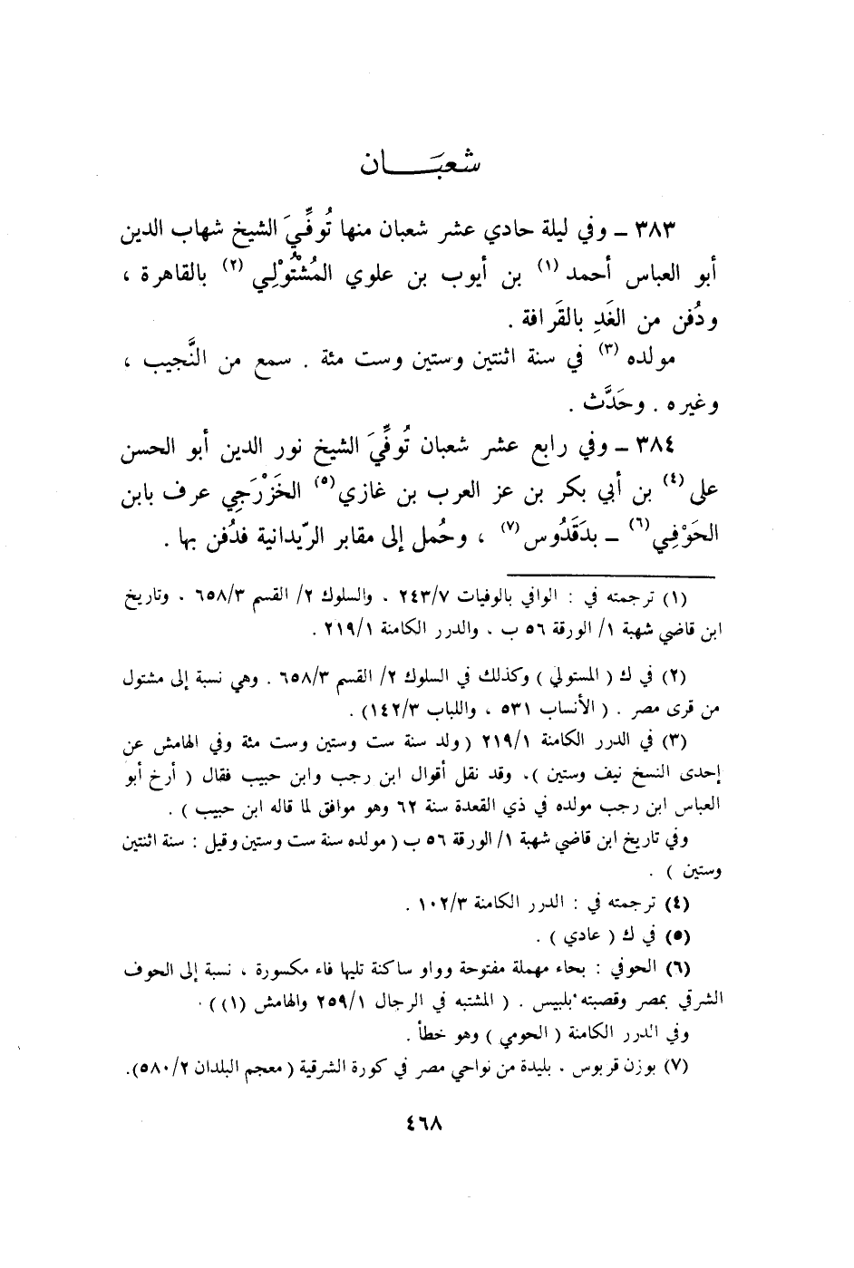 383 - وَفِي لَيْلَة حادي عشر شعْبَان مِنْهَا توفّي الشَّيْخ شهَاب الدّين أَبُو الْعَبَّاس أَحْمد بن ايوب بن علوي المشتولي بِالْقَاهِرَةِ وَدفن من الْغَد بالقرافة