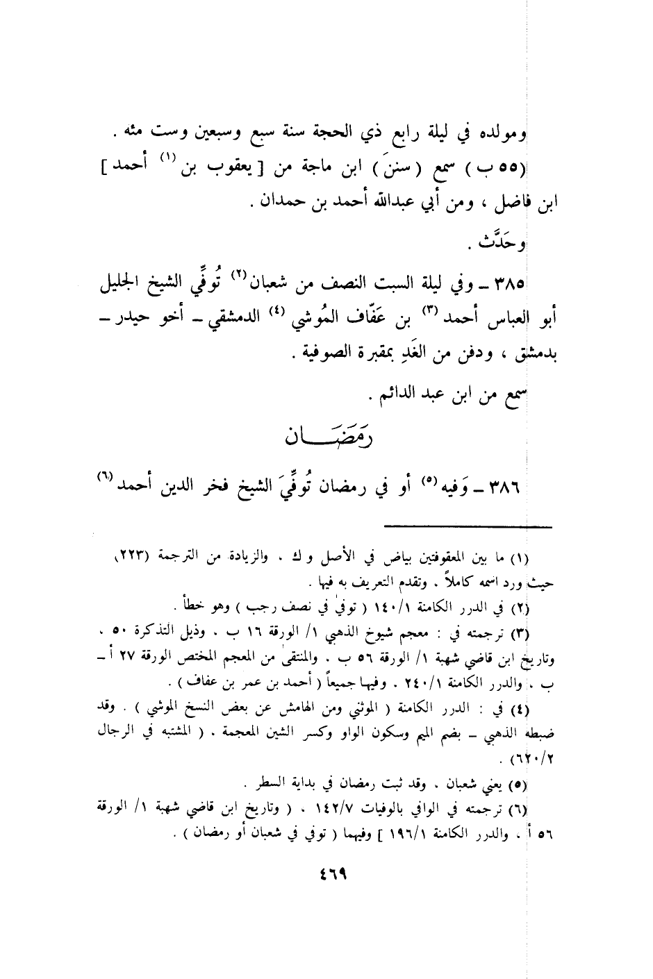 385 - وَفِي لَيْلَة السبت النّصْف من شعْبَان توفّي الشَّيْخ الْجَلِيل أَبُو الْعَبَّاس أَحْمد بن عفاف الموشي الدِّمَشْقِي أَخُو حيدر بِدِمَشْق وَدفن من الْغَد بمقبرة الصُّوفِيَّة