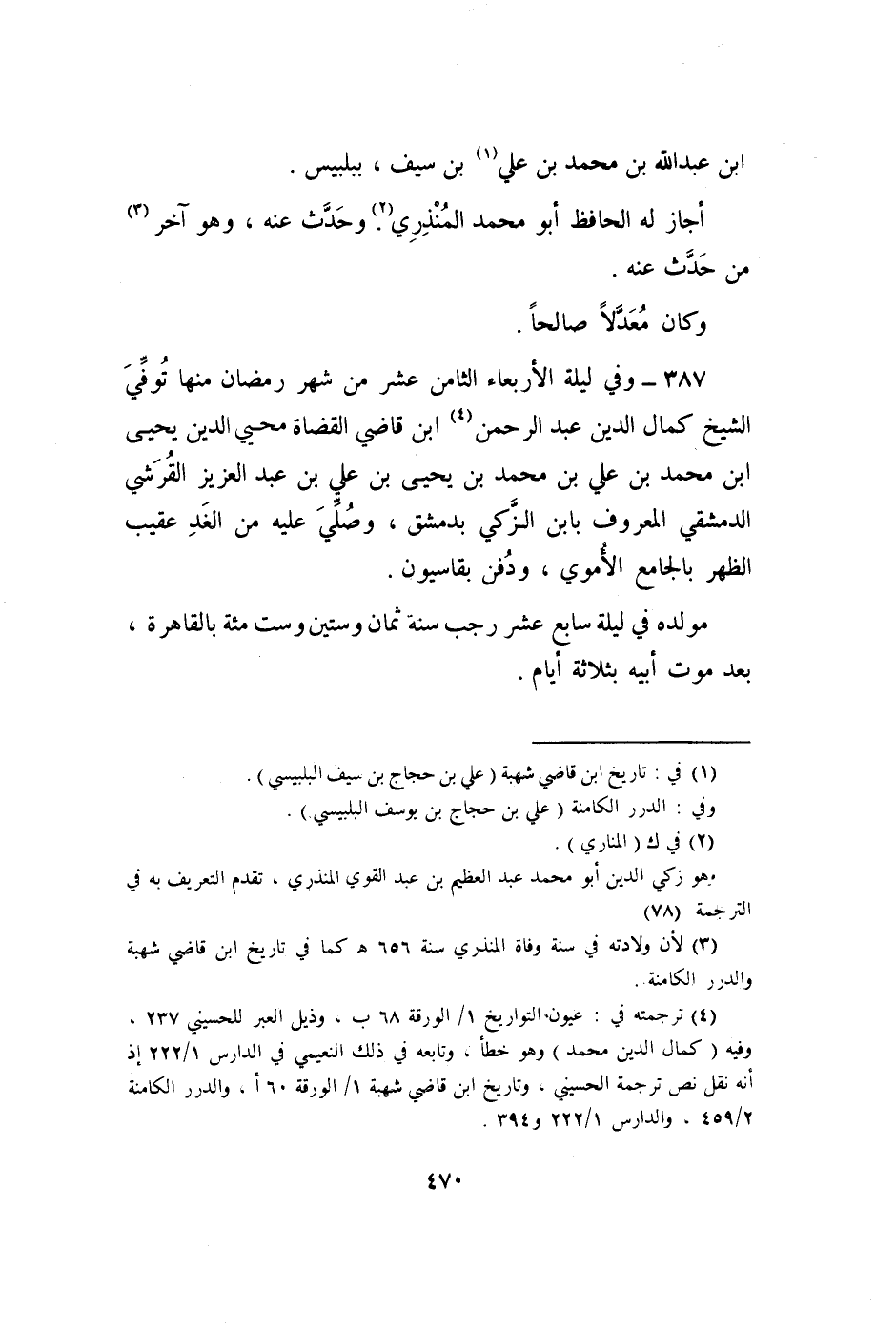 387 - وَفِي لَيْلَة الْأَرْبَعَاء الثَّامِن عشر من شهر رَمَضَان مِنْهَا توفّي الشَّيْخ كَمَال الدّين عبد الرَّحْمَن ابْن قَاضِي الْقُضَاة محيي الدّين يحيي ابْن مُحَمَّد بن عَليّ بن مُحَمَّد بن يحيى بن عَليّ بن عبد الْعَزِيز الْقرشِي الدِّمَشْقِي الْمَعْرُوف بِابْن الزكي بِدِمَشْق وَصلي عَلَيْهِ من الْغَد عقيب الظّهْر بالجامع الْأمَوِي وَدفن بقاسيون
