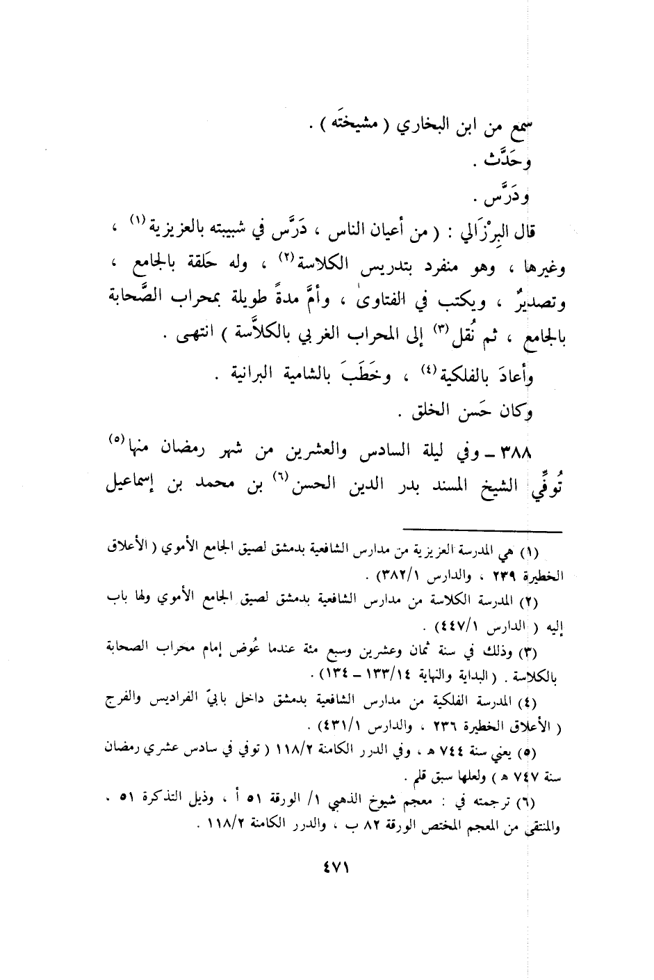 388 - وَفِي لَيْلَة السَّادِس وَالْعِشْرين من شهر رَمَضَان مِنْهَا توفّي الشَّيْخ الْمسند بدر الدّين الْحسن بن مُحَمَّد بن إِسْمَاعِيل
