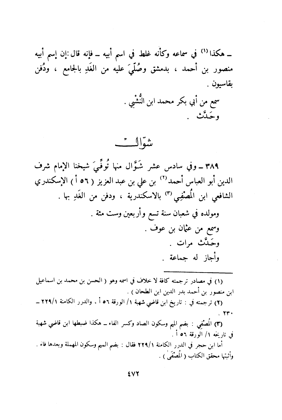 389 - وَفِي سادس عشر شَوَّال مِنْهَا توفّي شَيخنَا الإِمَام شرف الدّين أَبُو الْعَبَّاس أَحْمد بن عَليّ بن عبد الْعَزِيز (56 أ) الإسكندري الشَّافِعِي ابْن الْمُصَفّى بالاسكندرية وَدفن من الْغَد بهَا