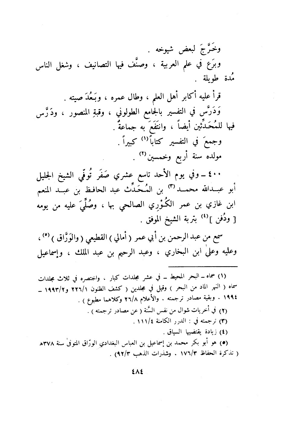 400 - وَفِي يَوْم الْأَحَد تَاسِع عشري صفر توفّي الشَّيْخ الْجَلِيل أبوعبد الله مُحَمَّد ابْن الْمُحدث عبد الْحَافِظ بن عبد الْمُنعم بن غَازِي بن عمر الكوري الصَّالِحِي بهَا وَصلي عَلَيْهِ من يَوْمه وَدفن بتربة الشَّيْخ الْمُوفق