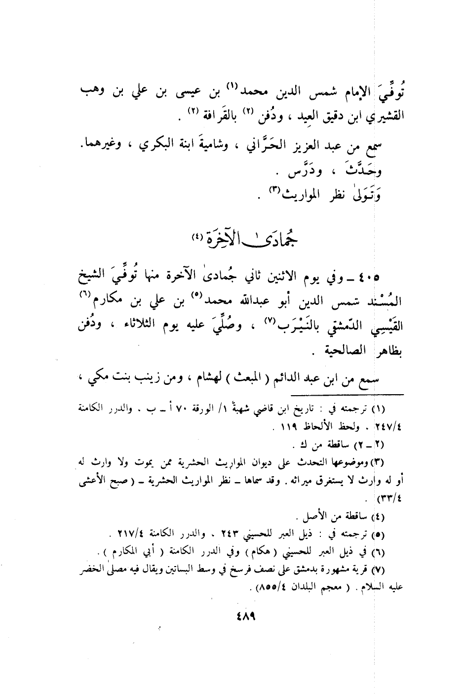405 - وَفِي يَوْم الِاثْنَيْنِ ثَانِي جُمَادَى الْآخِرَة مِنْهَا توفّي الشَّيْخ الْمسند شمس الدّين أَبُو عبد الله مُحَمَّد بن عَليّ بن مَكَارِم الْقَيْسِي الدِّمَشْقِي بالنيرب وَصلي عَلَيْهِ يَوْم الثُّلَاثَاء وَدفن بِظَاهِر الصالحية
