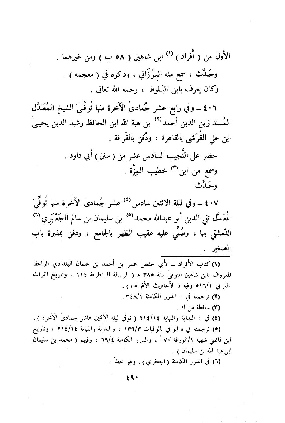 406 - وَفِي رَابِع عشر جُمَادَى الْآخِرَة مِنْهَا توفّي الشَّيْخ الْمعدل الْمسند زين الدّين احْمَد بن هبة الله بن الْحَافِظ رشيد الدّين يحيى بن عَليّ الْقرشِي بِالْقَاهِرَةِ وَدفن بالقرافة