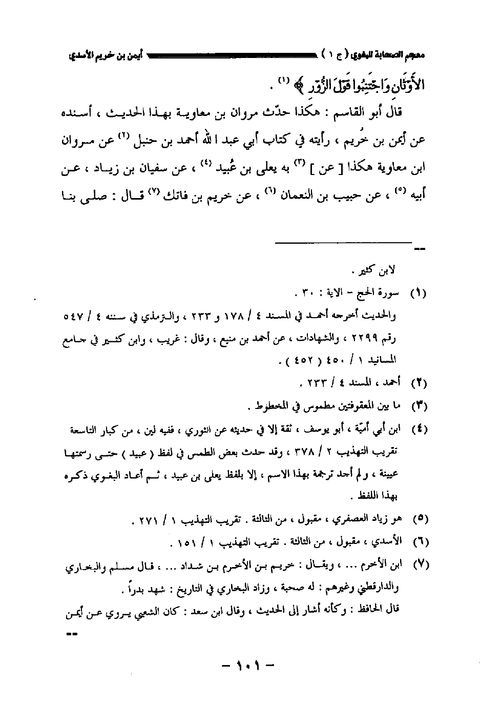 قال أبو القاسم: هكذا حدث مروان بن معاوية بهذا الحديث أسنده عن أيمن بن خريم رأيته في كتاب أبي عبد الله أحمد بن حنبل عن مروان بن معاوية هكذا [عن] به يعلى بن عبيد عن سفيان بن زياد عن أبيه عن حبيب بن النعمان عن خريم بن فاتك قال: صلى بنا